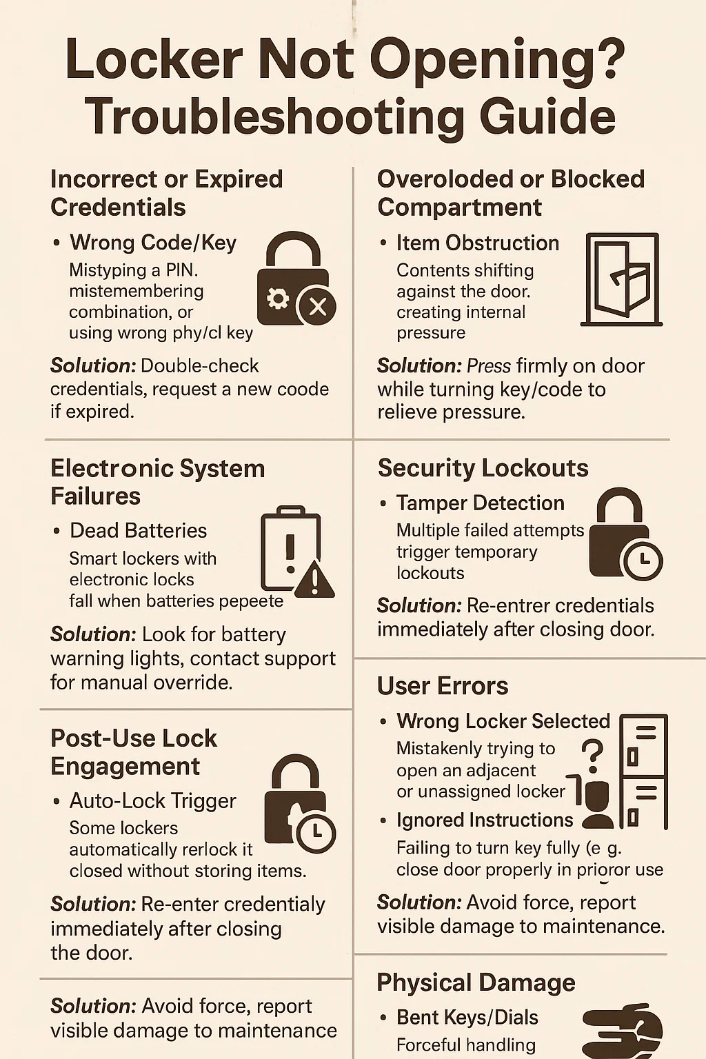 Narito ang isang pagkasira ng mga karaniwang kadahilanan kung bakit a locker Maaaring hindi buksan, kasama ang mga praktikal na hakbang sa pag -aayos:
